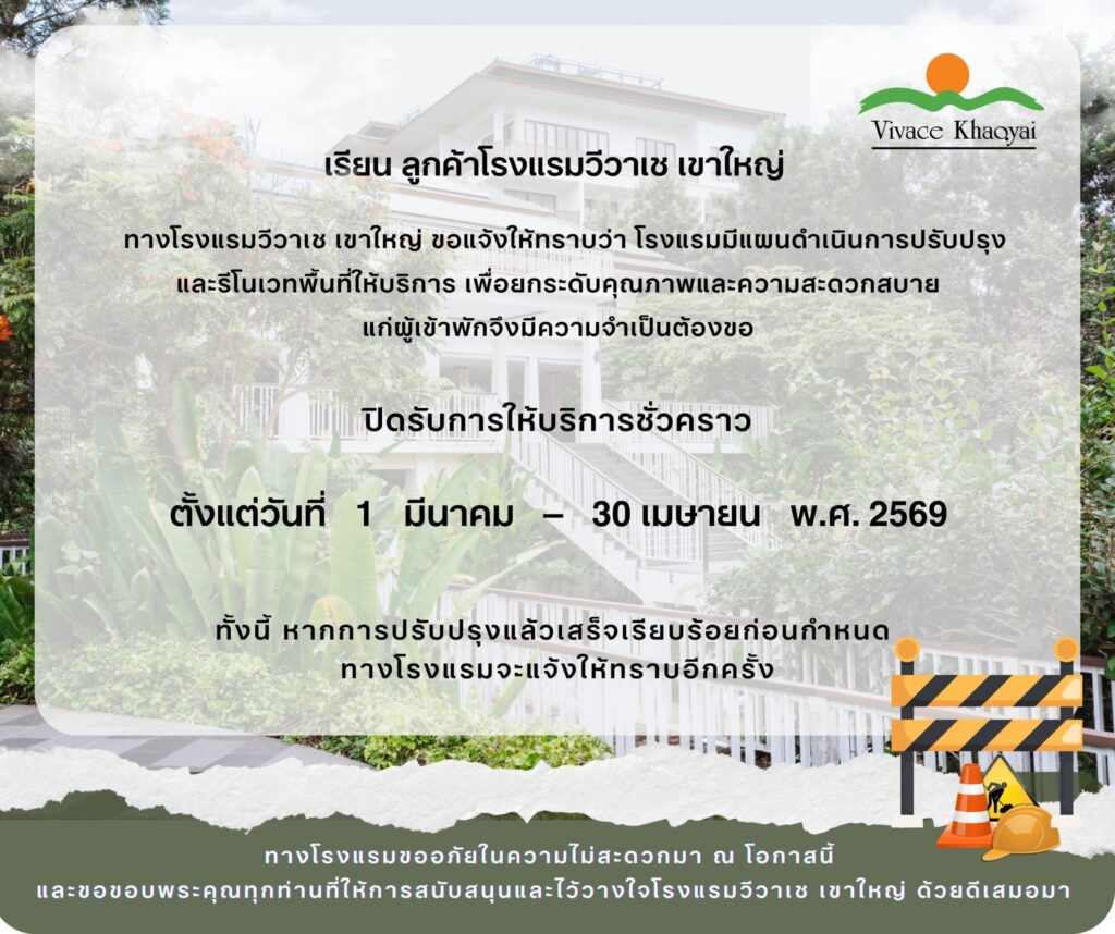 ทางโรงแรมวีวาเช เขาใหญ่ ขอแจ้งให้ทราบว่า โรงแรมมีแผนดำเนินการปรับปรุงและรีโนเวทพื้นที่ให้บริการ เพื่อยกระดับคุณภาพและความสะดวกสบายแก่ผู้เข้าพัก